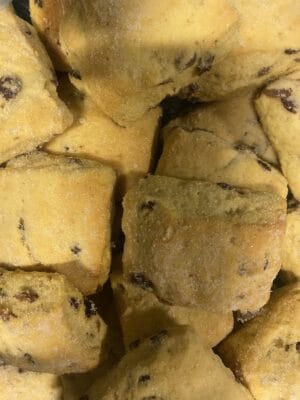Een heerlijk broodje op basis van kwarkdeeg gevuld met rozijnen en bestrooid met een beetje suiker.