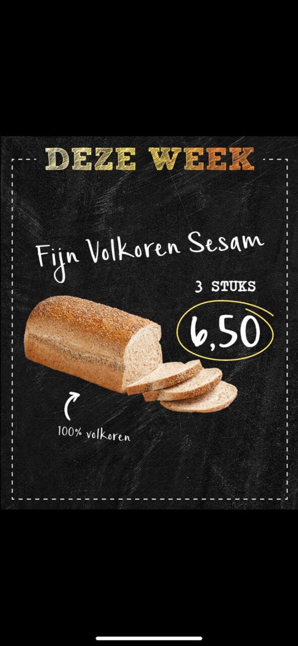 100% volkoren brood met sesam op de korst nu 3 stuks 6,50.