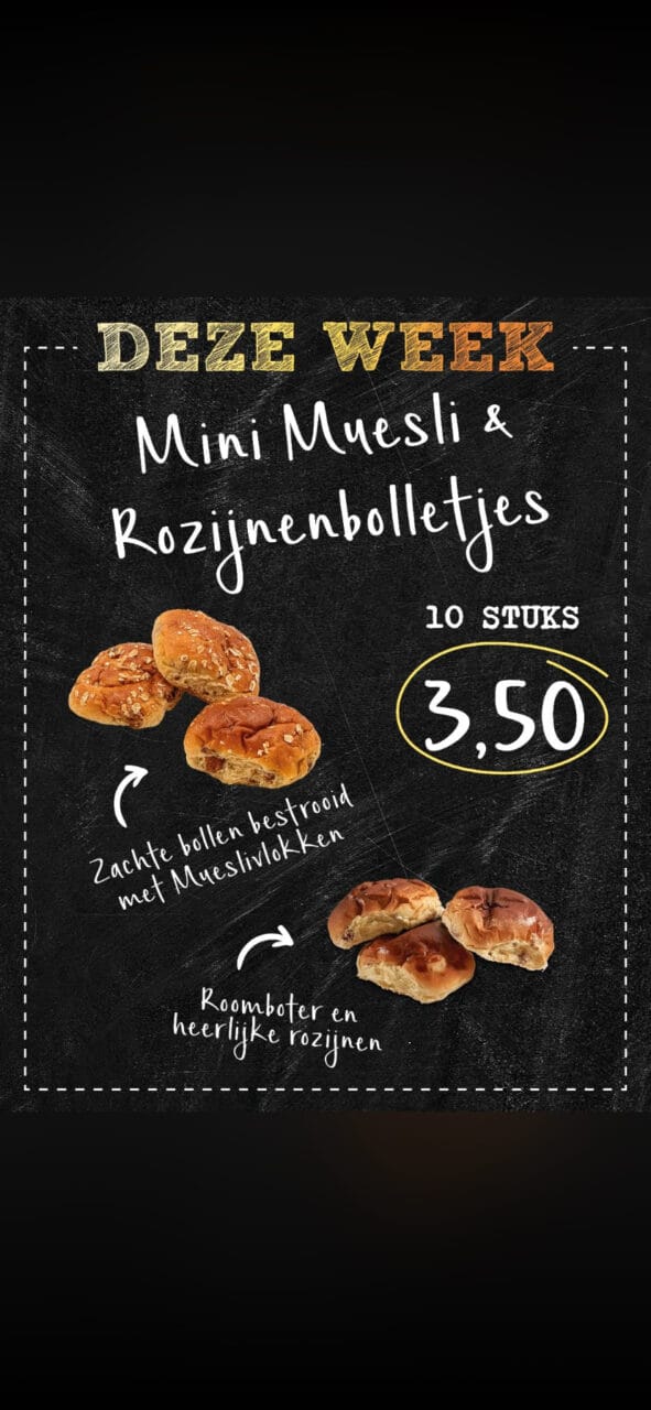 Mini muesli en rozijnen bolletjes 10 stuks 3,50.