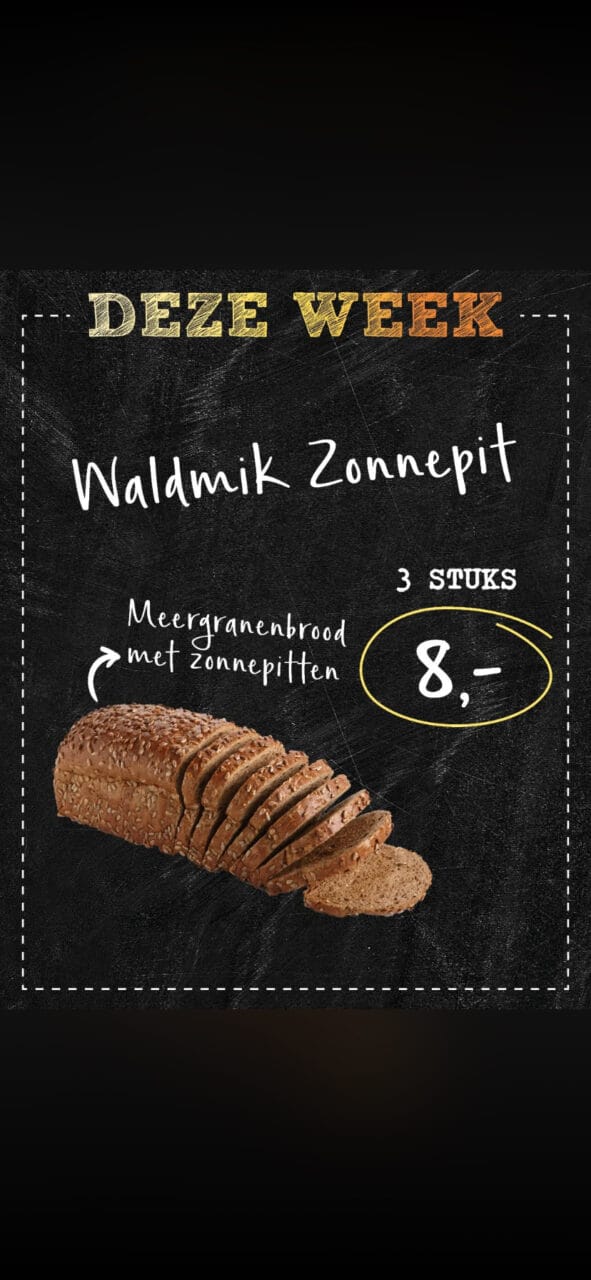 Meergranenbrood met zonnepitten nu 3 stuks 8 euro.